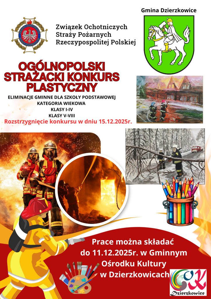 Gmina Dzierzkowice zaprasza uczniów szkół podstawowych z terenu gminy do udziału w gminnych eliminacjach Ogólnopolskiego Strażackiego Konkursu Plastycznego 2025–2026, organizowanego przez Oddział Wojewódzki Związku Ochotniczych Straży Pożarnych RP w Lublinie.