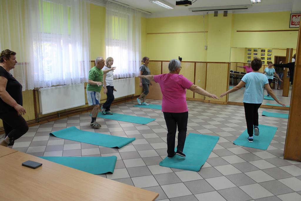 W okresie jesienno-zimowym uczestnicy biorą udział w ćwiczeniach ruchowych z instruktorem, które pomagają utrzymać sprawność fizyczną i pozytywną energię mimo chłodniejszej aury.